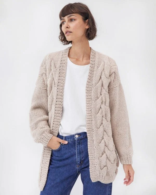 This knit is loose and twisted, made from wool and alpaca with a hand-knitted plaited design, each is ever so slightly unique. Designed to throw on spontaneously to keep you cozy and warm through the seasons. Twisted Erik is a longer style cardigan which means extra comfort and warmth.